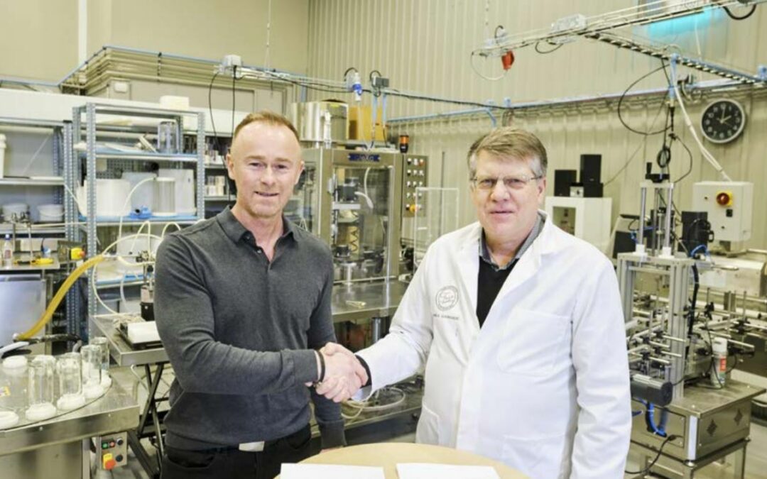 Davíð Már Sigurðsson, framkvæmdastjóri og eigandi Pronano, og Jakob S. Bjarnason, framkvæmdastjóri og eigandi Foss Distillery, handsala samning um samstarf við CCM.